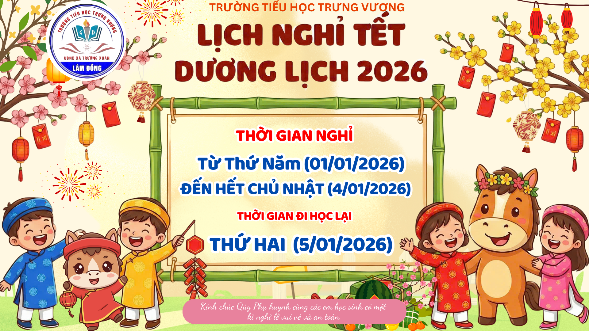 🏫 Trường TH TRƯNG VƯƠNG trân trọng thông báo đến quý phụ huynh và các em học sinh lịch nghỉ Tết Dương lịch như sau: